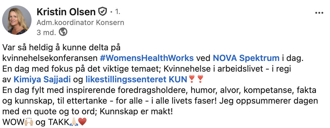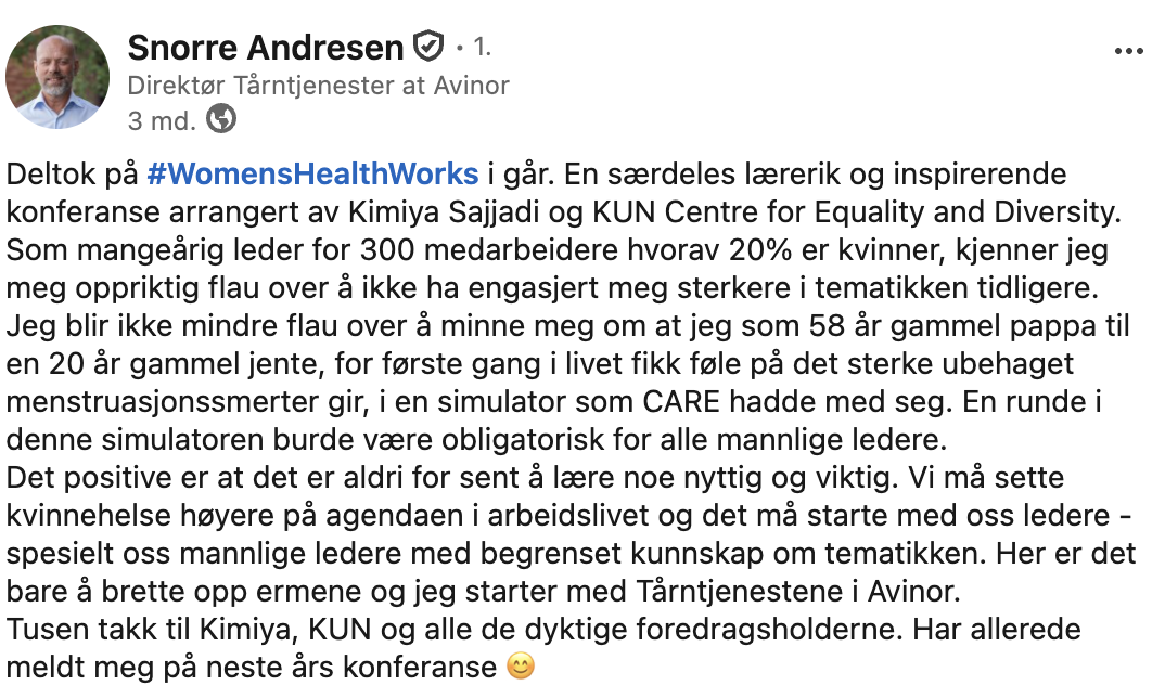 Ved å implementere verktøyene og kunnskapen du får under Women´s Health Works konferansen vil du ikke bare skape en enda bedre arbeidsplass – du vil også være med å kjempe et av våre tids viktigste likestillingskamper.